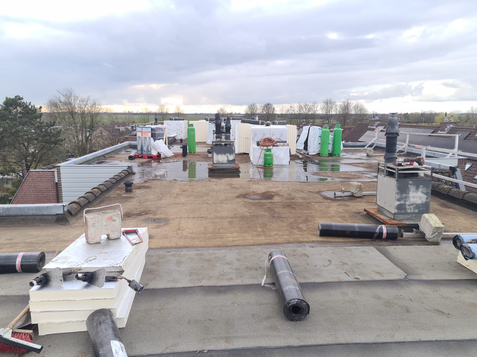 Bovenop de isolatie is een nieuwe laag bitumen dakbedekking aangebracht, geleverd door de Mapei Groep. Dit materiaal staat bekend om zijn betrouwbaarheid en lange levensduur, waardoor het dak jarenlang bestand blijft tegen weer en wind.